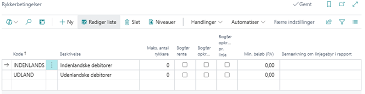 Nedenfor har vi opsat to rykkerbetingelseskoder, der differentierer den indenlandske rykkerprocedure fra den udenlandske.
