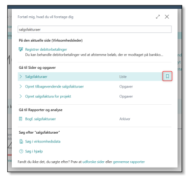 Bliver du ofte træt af at navigere gennem tre menuer for at finde en specifik rapport eller oversigt? Med bogmærke-funktionen kan du tilføje enhver side direkte til din navigationsmenu i Rollecenteret. Find blot siden via søgefunktionen (Tell Me) og klik på det lille bogmærke-ikon. Det svarer til at have de vigtigste redskaber liggende øverst i værktøjskassen.
